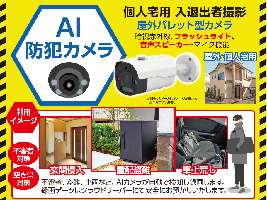 AI防犯カメラサービス開始のお知らせ 平素より当社サービスをご利用いただき、誠にありがとうございます。 この度、昨今の犯罪情勢において、皆様の安心・安全な暮らしをサポートするために、AI搭載防犯カメラのレンタルサービスを開始いたします。 本カメラの録画データはクラウドサーバー上に保存され、有事の際にはプッシュ通知が届きます。また、当社が取付工事まで行うため、安心してご利用いただけるサービスとなっております。 さらに今なら、あゆネットひかりと同時にAI防犯カメラをお申し込みの方に、25,000円をキャッシュバックするキャンペーンを実施中です。お得なこの機会にぜひご利用をご検討ください。 サービス概要 録画データ60日間クラウド保存 カメラの録画データはクラウドサーバーにて安全にお預かりするため、盗難等によるデータ紛失リスクが低減できます。 AI自動編集 有事の際のみ、AIが不要な平時映像を自動カットし、後から映像を確認しやすいようにインデックスを付けます。 24時間自動監視 夜間も含めて、常に監視を行います。 ライト・スピーカー威嚇機能 不審者を威嚇するための機能を搭載。 マルチデバイス対応アプリ スマホ、タブレット、PCなど、様々なデバイスからアクセス可能です。 安心の自社取付工事 当社にて取付工事を行うため、お客様ご自身でのお取り付けは不要です。 ご利用料金 初期工事費用:33,000円(税込) 月額利用料 : 2,728円(税込) 当社あゆネットひかり戸建プランとセットでご利用いただくと、月額利用料が1,100円(税込)割引に なります。 最低ご利用期間 最低利用期間は設置月を含む36ヶ月です。 最低利用期間内のご解約時は、別途下記違約金が発生します。 1~12ヶ月:30,000円、13~24ヶ月:20,000円、25~36ヶ月:10,000円 ※料金は不課税 キャンペーン内容 2025年9月30日(火)までにあゆネットひかりと同時にAI防犯カメラをお申し込みの方は、工事完了後25,000円をキャッシュバックします。 本件に関するお問い合わせ フリーコール:0120-48-5541(受付時間 9:30–17:00) お問合せフォーム